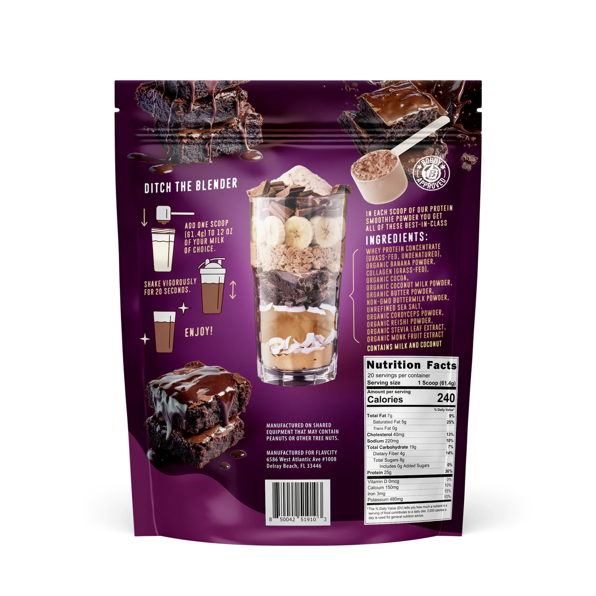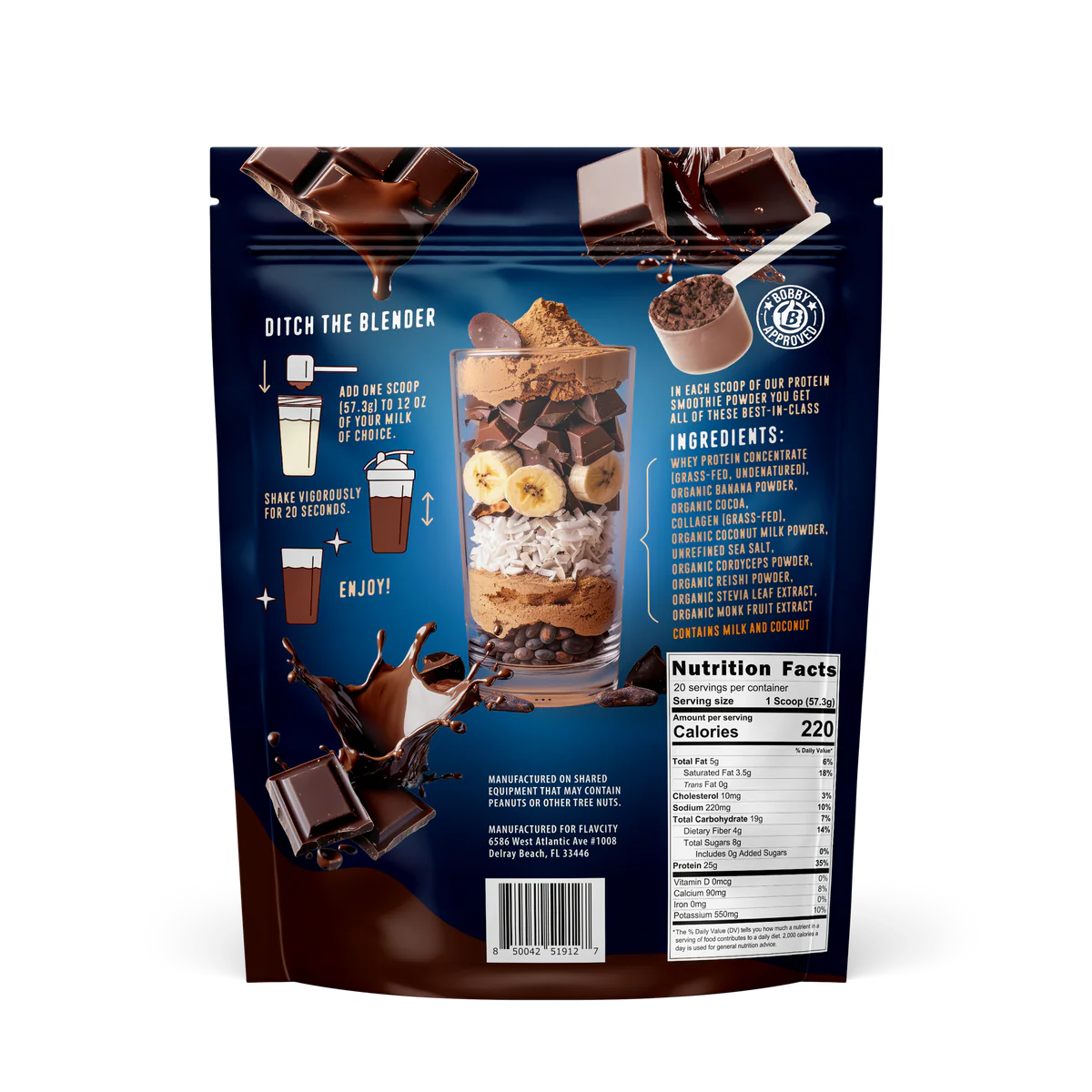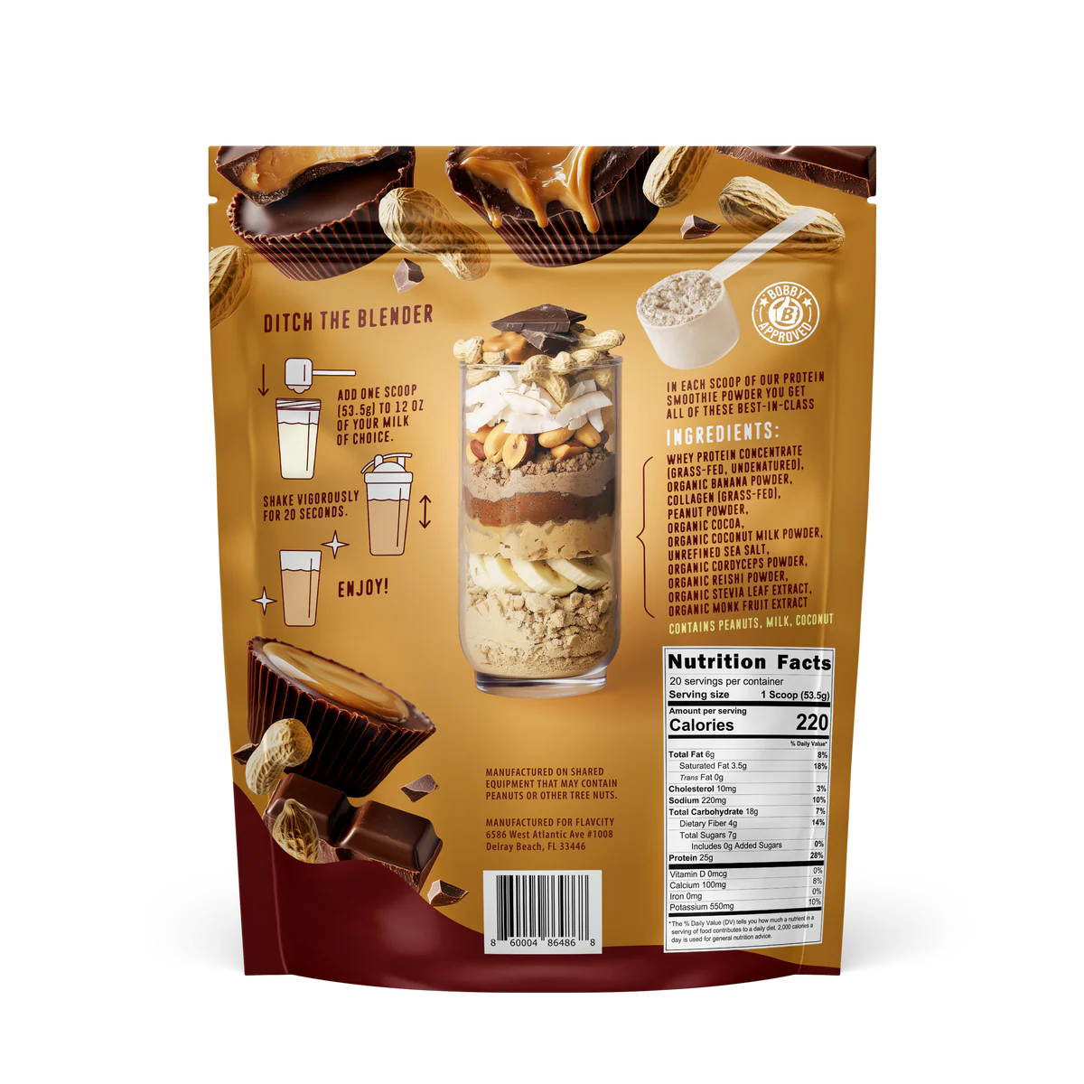 Whey Protein Concentrate (grass-fed, undenatured), Collagen (grass-fed), Organic Banana Powder, Organic Coconut Milk Powder, Vanilla Extract, Unrefined Sea Salt, Organic Cordyceps Powder, Organic Reishi Powder, Organic Stevia Leaf Extract, Organic Monk Fruit Extract